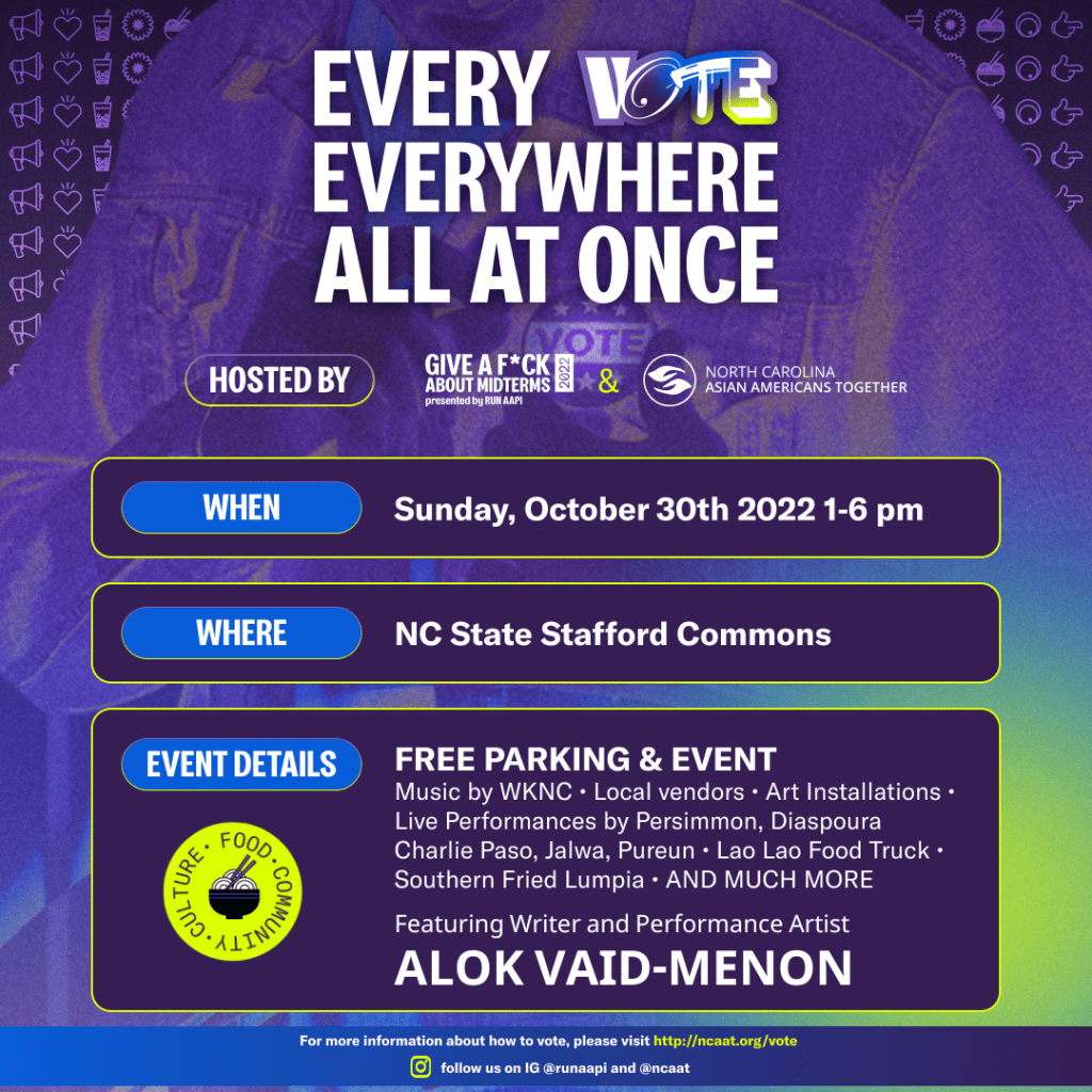 RUN AAPI and North Carolina Asian Americans Together (NCAAT) joined forces ahead of the midterm elections to lift up the political power of the Asian American and Pacific Islanders in the South – an emerging political force. This activation centered local AAPI food trucks, vendors, creatives and artists, an opportunity for young AAPIs to learn what’s on the ballot, and a special performance by gender non-conforming writer and performance artist Alok Vaid-Menon.